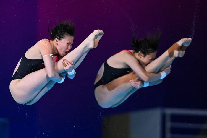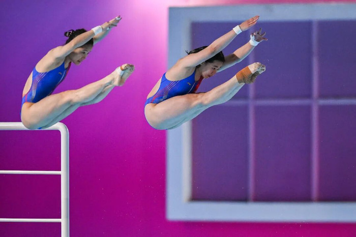 从第一跳至第五跳的全程比拼中,陈芋汐/掌敏洁始终保持稳定发挥。无论是难度系数3.2的407C(反身翻腾三周半抱膝),还是对技术细节要求极高的5253B(向后翻腾两周半转体一周半屈体),两人均配合默契,动作衔接流畅,空中姿态舒展,入水效果精准,每一轮得分均稳居榜首,最终以较大优势将金牌收入囊中。