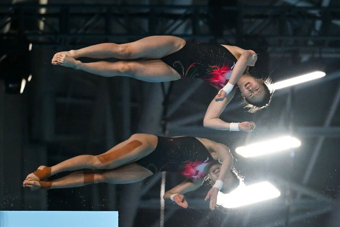 作为赛前焦点组合之一,上海队陈芋汐/掌敏洁在当日上午的预赛中便展现出强劲竞争力,以预赛第一的成绩顺利晋级决赛,为晚间比拼奠定了良好基调。决赛伊始,两人便迅速进入状态,首跳选择经典动作201B,无论是空中翻腾的同步性,还是入水瞬间的“水花控制”,均展现出水准,裁判给出高分,一举确立领先优势。